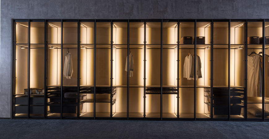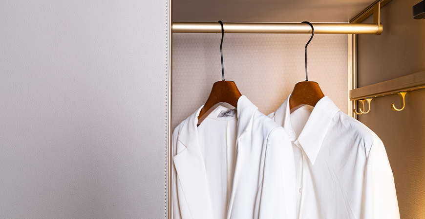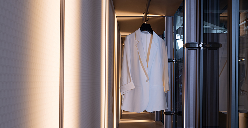 柜內(nèi)線燈位于立柱槽口向內(nèi)照射,不刺眼,且光線不會(huì)被懸掛的衣物等收納物品遮擋,方便物品的取用。
